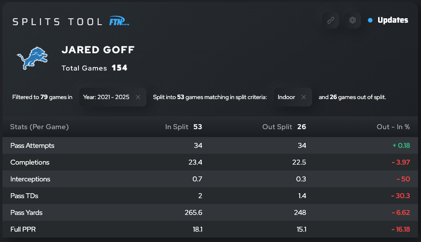 Sometimes, it really is simple. Jared Goff plays much better indoors. Since joining the Lions in 2021, Goff’s passing stats go down rather significantly when playing in fresh air.